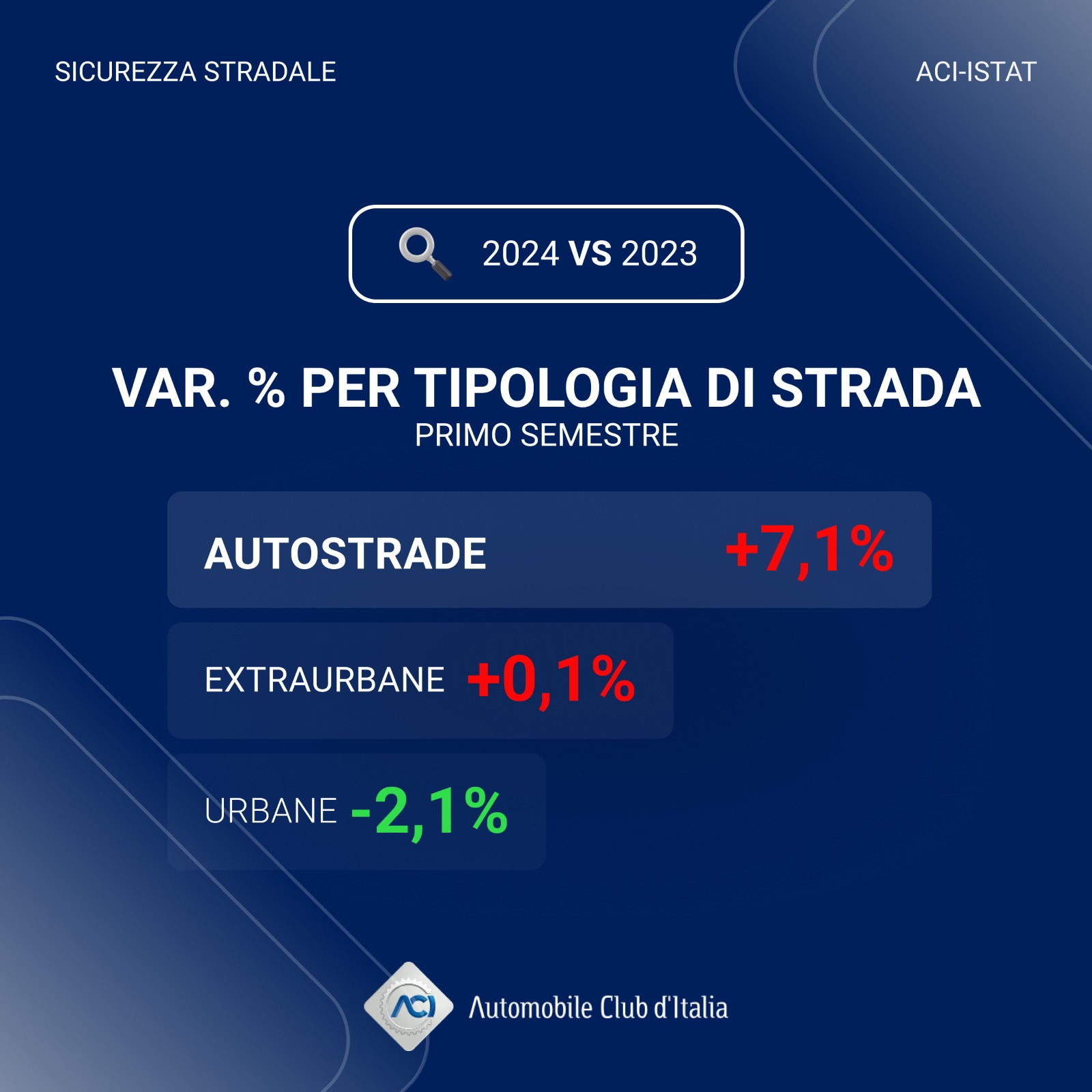 - Tra il 2023 e il 2024, gli incidenti e i feriti aumentano su tutte le tipologie di strade, soprattutto sulle autostrade (+6,9% incidenti, +7,0% feriti). Anche il numero delle vittime aumenta in maniera marcata sulle autostrade (+7,1%), a fronte della diminuzione sulle strade urbane (-2,1%) e del leggero aumento su quelle extraurbane (+0,1%). Gli incidenti su autostrade e strade extraurbane aumentano anche nel confronto con il 2019 (+4,0% e +2,7% rispettivamente).