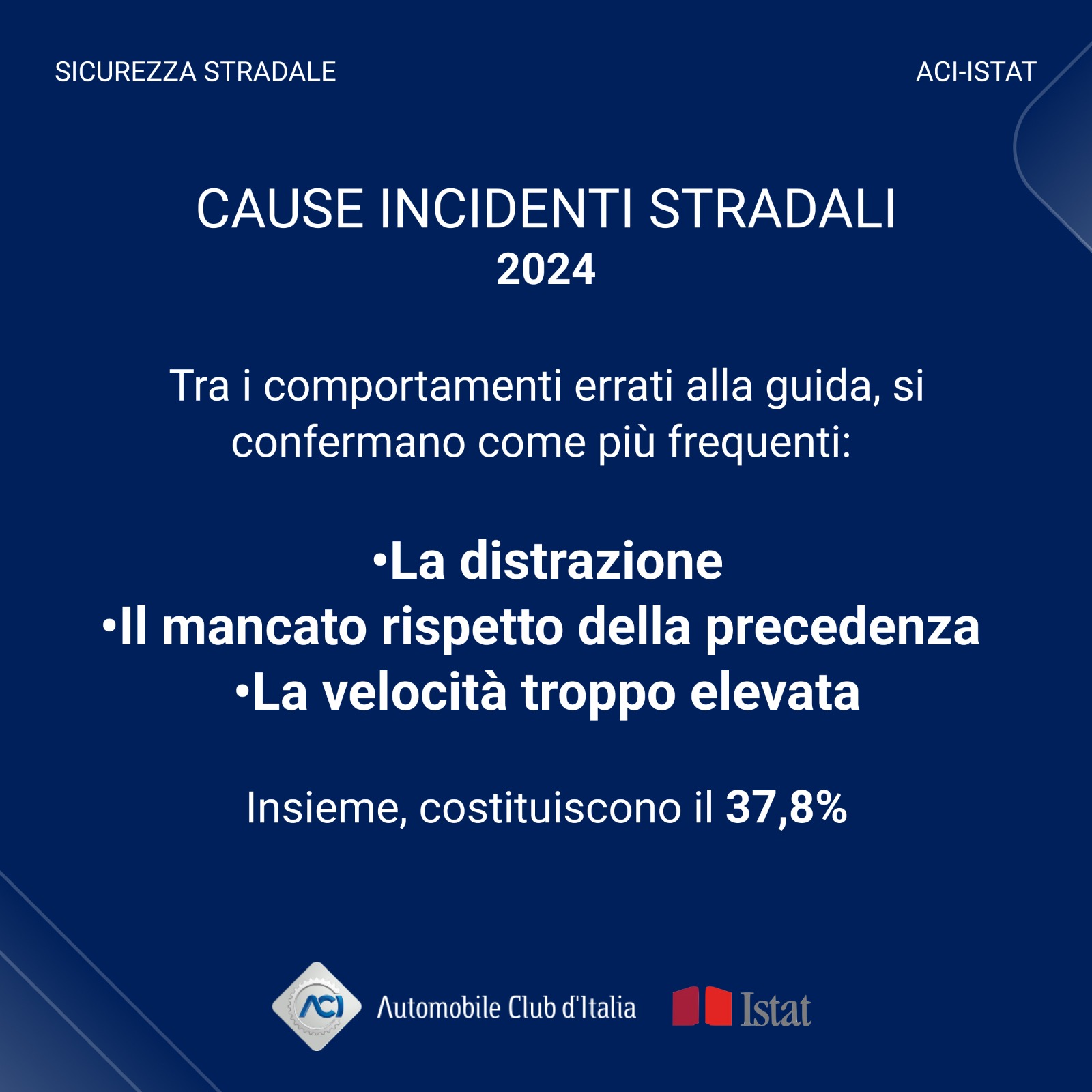 - I comportamenti errati alla guida più frequenti si confermano essere la distrazione, il mancato rispetto della precedenza e la velocità troppo elevata. Insieme, costituiscono il 37,8% delle cause (85.339 casi), valore stabile nel tempo.